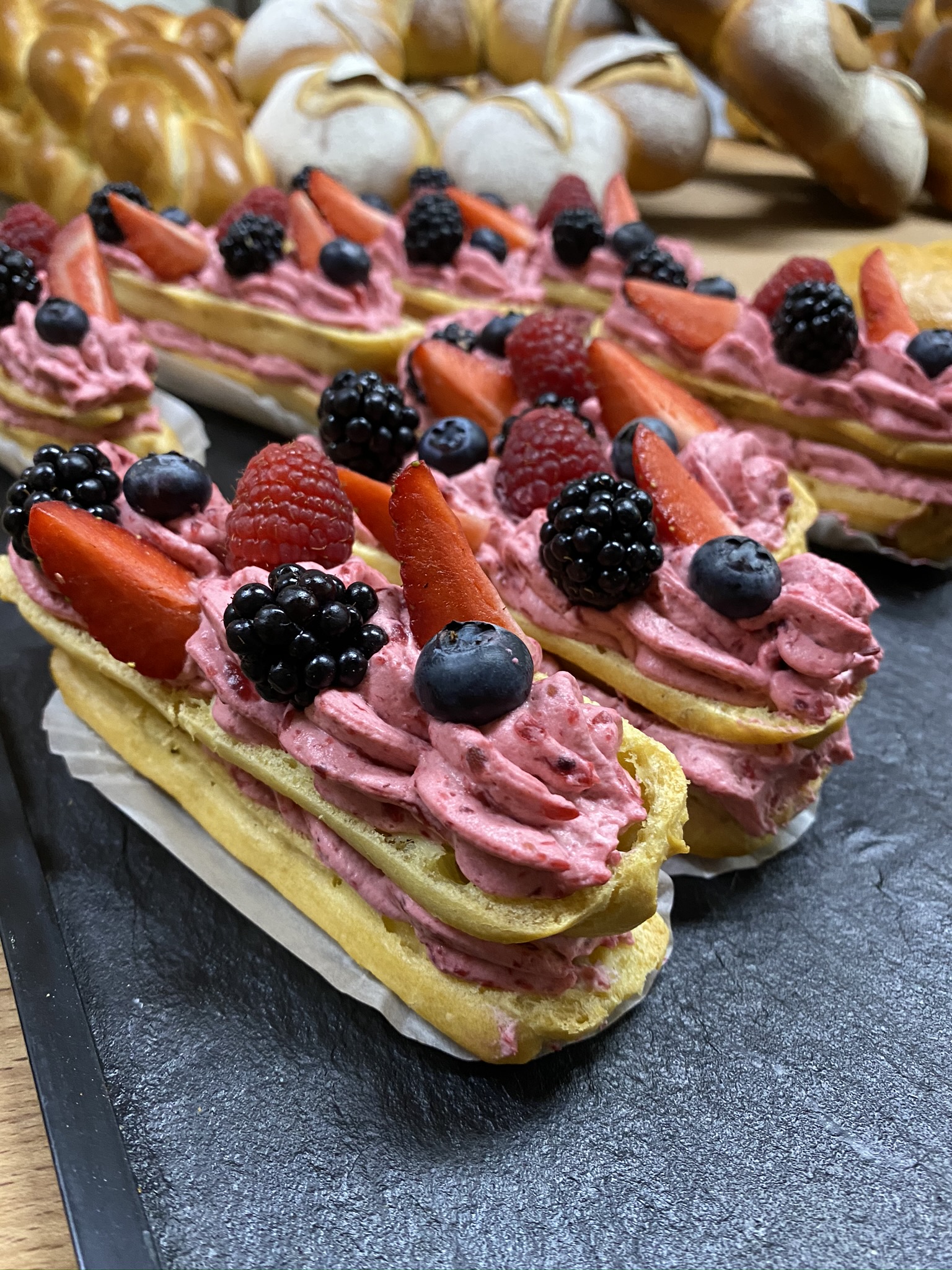Découvrez un large choix de pains, viennoiseries, pâtisseries régionales (Flûte au sel, Gâteau du Doubs…) et un Tea‑Room chaleureux (45 places + terrasse 20 places) pour savourer sur place en toute convivialité.