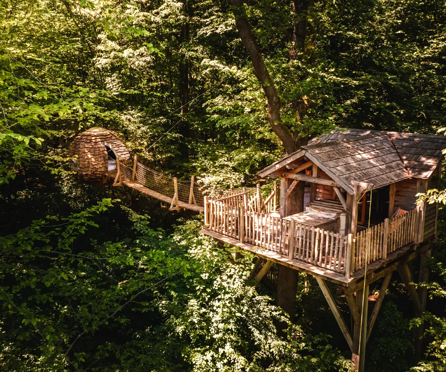 - des cabanes perchées dans les arbres, entre 5 et 13 mètres de haut, accessibles par escalier, pont de singe ou échelle