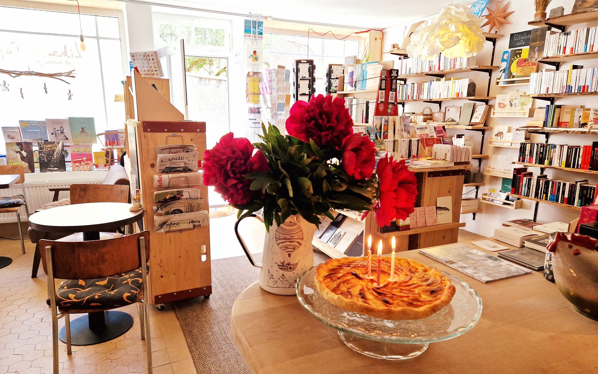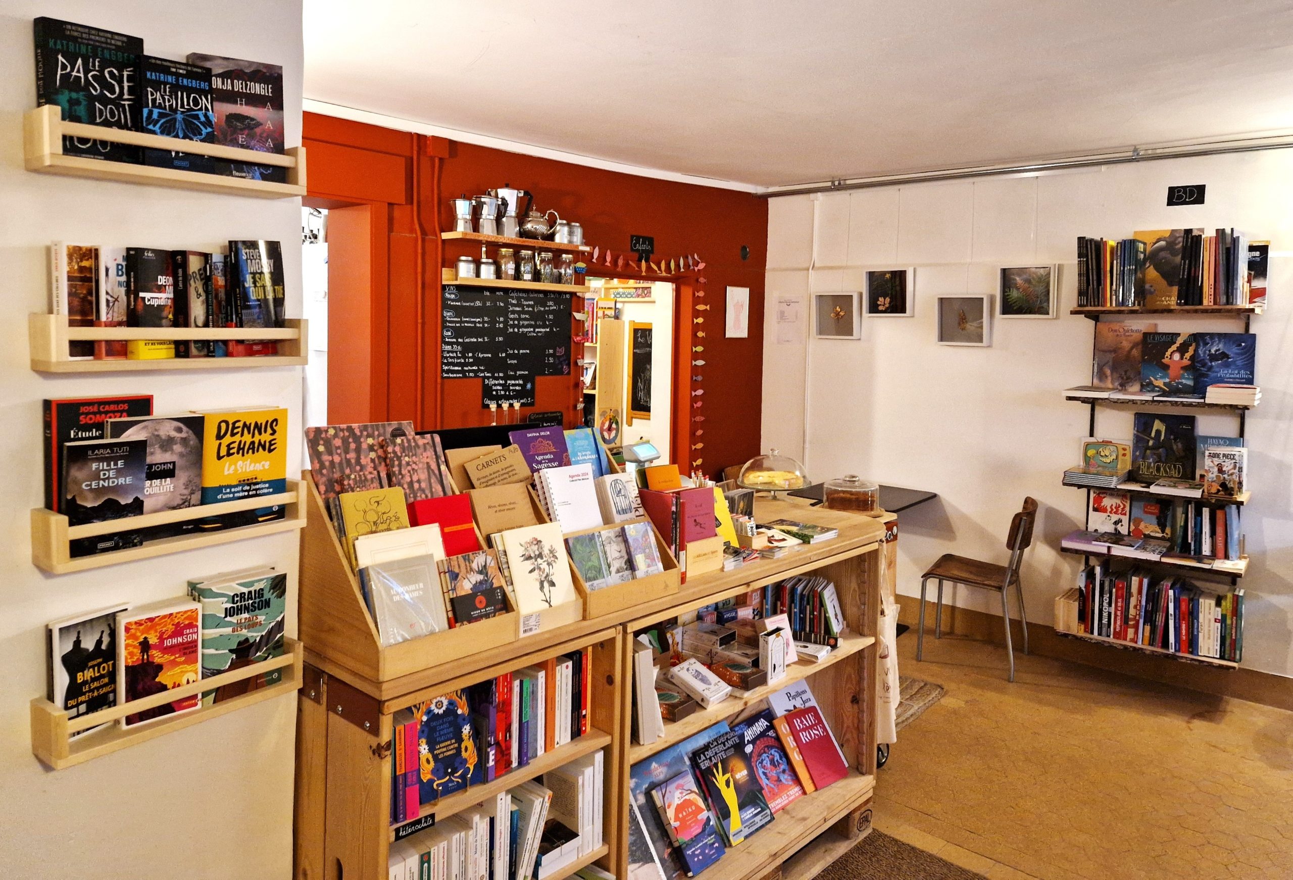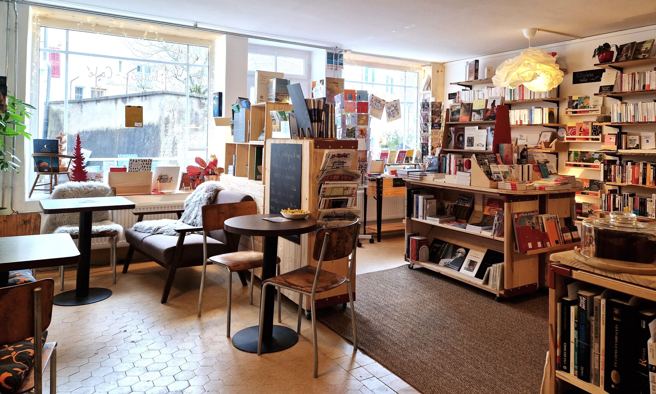 Un lieu chaleureux alliant livres neufs & occasions (adultes, enfants), papeterie et jeux fabriqués localement, et un café bio avec mets faits maison issus de circuits courts. Evénements multiples : rencontres, ateliers, concerts et randonnées littéraires.